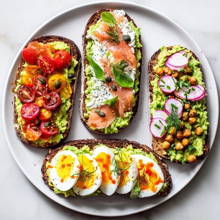 Save to Pinterest A vibrant collection of avocado toast variations, perfect for quick snacks, light lunches, or stylish starters.