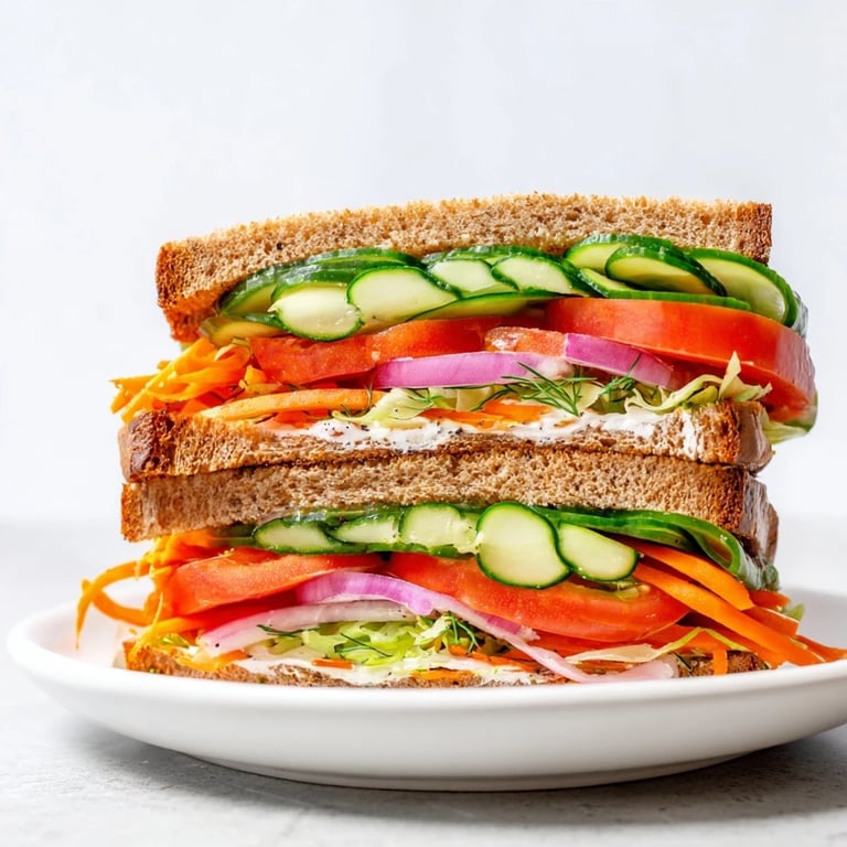 It's a sandwich that doesn't apologize for being a vegetable showcase. The spreads and pickles carry the flavor weight, so every vegetable gets to shine without competing. There's no meat, no cheese to hide behind—just intentional layers that trust each other. It tastes like something you'd order at a very particular deli, but it comes together in your own kitchen in fifteen minutes flat.
