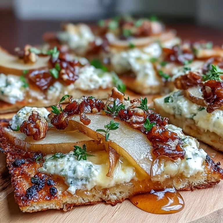 This flatbread is absolutely best eaten fresh and warm, straight from the oven when the cheese is still melting into the pear slices. If you do have leftovers, they'll keep covered in the fridge for a day, though the texture won't be quite the same—I'd recommend eating them cold rather than reheating them. For variations, pecans work beautifully if you don't have walnuts, blue cheese brings a stronger personality if you want to go that route, and an extra sprinkle of chili flakes before baking gives you more heat without relying solely on the honey drizzle.