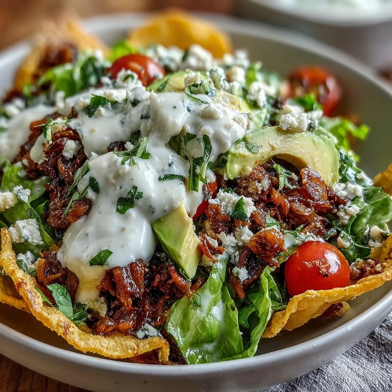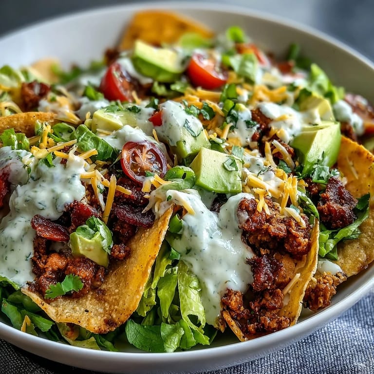 - Divide your chopped romaine lettuce among the crispy tortilla bowls, then top each one with the warm turkey mixture, fresh cherry tomato halves, avocado slices, and a scatter of shredded cheddar cheese. Drizzle everything generously with the Greek yogurt ranch dressing and serve immediately while the tortilla bowl is still crispy and the flavors are fresh.