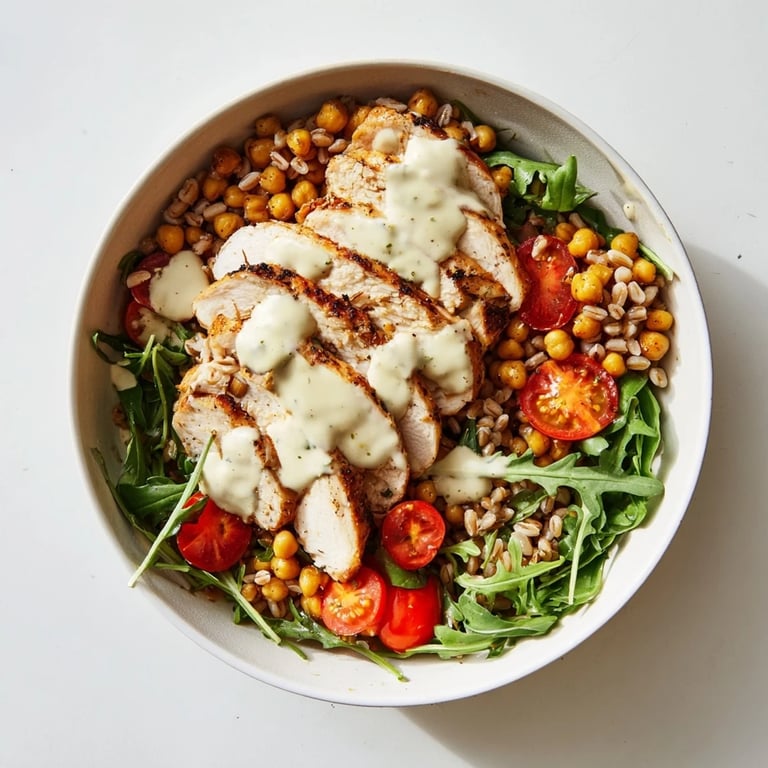 The chicken, farro, and roasted chickpeas all keep beautifully in the fridge for up to four days. Just store the sauce separately and assemble fresh each day so nothing gets soggy.