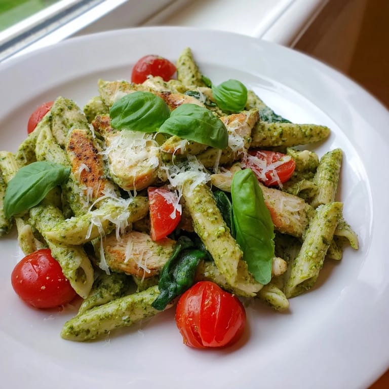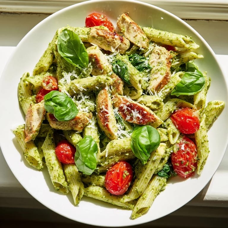 Save to Pinterest There's something about the smell of basil hitting a hot pan that makes everything feel a little less rushed, even on nights when you're cooking dinner at 6:47 PM because someone has soccer practice at 7:30. This pesto chicken pasta became my answer to the question I ask myself most evenings: what can I make that tastes like I tried, but doesn't make me lose my mind? The beauty of it is that it genuinely tastes like you've been thinking about dinner all day, when really you've been thinking about literally anything else.