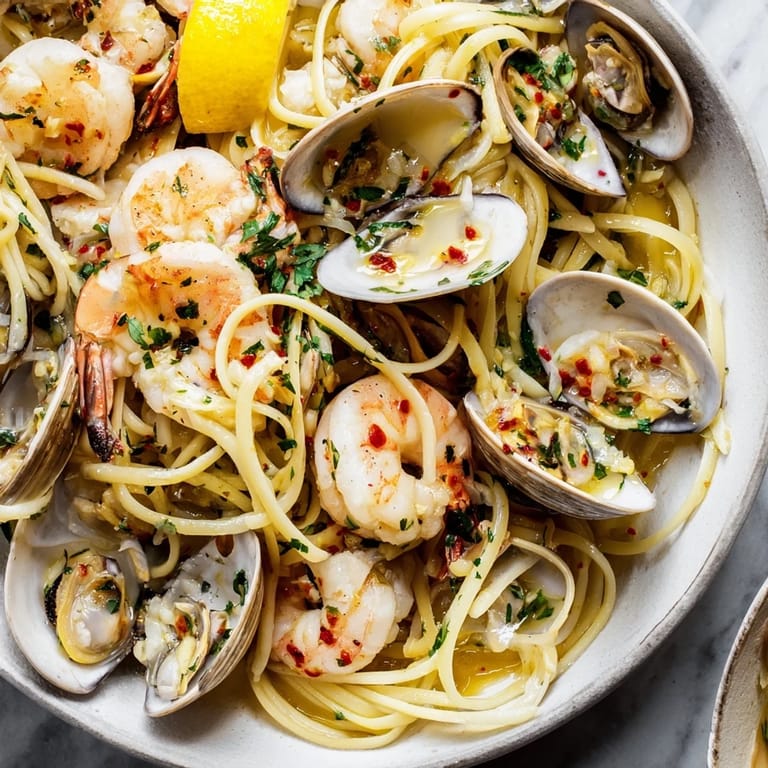 Save to Pinterest There's something about the sizzle of garlic hitting hot oil that makes me stop whatever I'm doing and pay attention. One Friday evening, I found myself at the fishmonger's counter with no real plan, just a craving for something that tasted like the coast. The vendor recommended a mix of shrimp, clams, and mussels, and within an hour I'd created this seafood linguine—a dish that's since become my go-to when I want to feel like I'm cooking something restaurant-worthy without the stress.