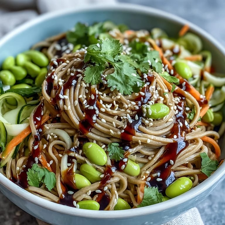- Noodles & Vegetables: 250 g dried soba noodles, 1 cup shelled edamame (fresh or frozen), 1 medium cucumber (julienned), 2 medium carrots (peeled and julienned), 2 scallions (thinly sliced), 2 tbsp toasted sesame seeds, 1/4 cup fresh cilantro or mint leaves (optional).