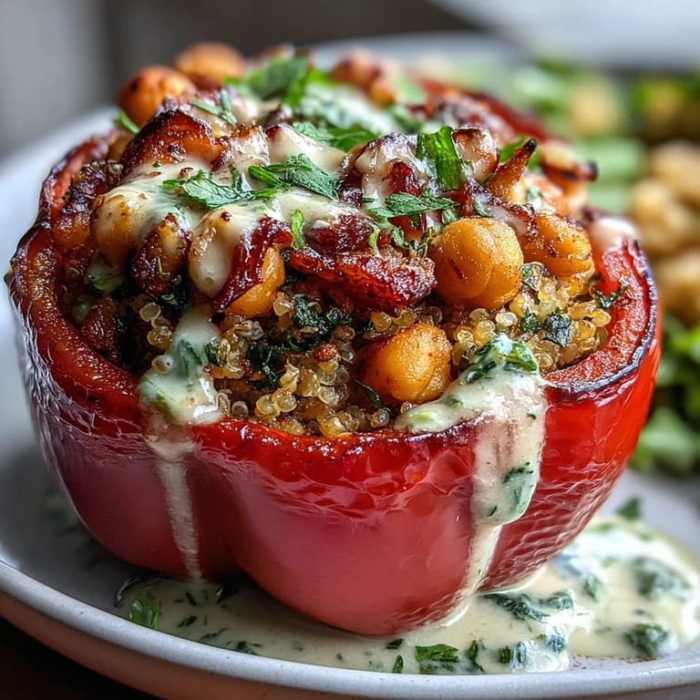 The chickpeas provide protein and a satisfying earthiness, while the quinoa or rice gives the filling structure so it doesn't fall apart. The Mediterranean spices—oregano, cumin, smoked paprika—work together to create a flavor profile that feels familiar and comforting, but the lemon tahini sauce brings everything into focus with brightness and creaminess that makes your taste buds wake up. Bell peppers are almost specifically designed to hold something, and they soften beautifully in the oven while the roasted flavors develop, creating this perfect contrast between tender pepper and hearty filling.