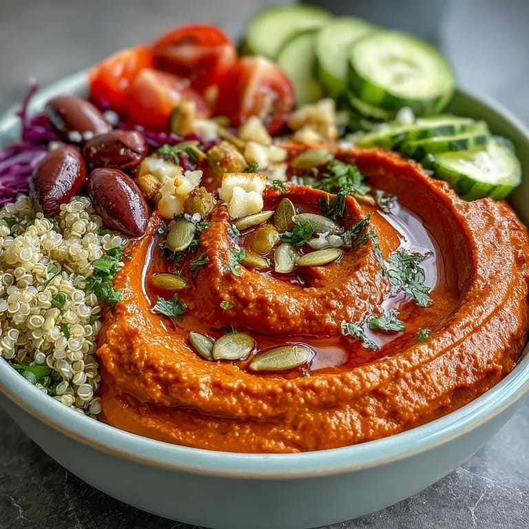 Save to Pinterest There's something about assembling a bowl that feels less like cooking and more like creating—a blank canvas where every vegetable gets to shine. I discovered the magic of roasted red pepper hummus on a lazy Sunday afternoon when I was determined to use up some charred peppers from my farmers market haul, and what started as an experiment became the centerpiece of every lunch I've packed since. The hummus is silky, slightly smoky, and tastes nothing like the tired beige version people assume hummus must be. What makes these bowls truly special isn't just the hummus though; it's how every element—the crisp vegetables, the nutty grains, the creamy avocado—comes together to make you feel nourished without any fuss.