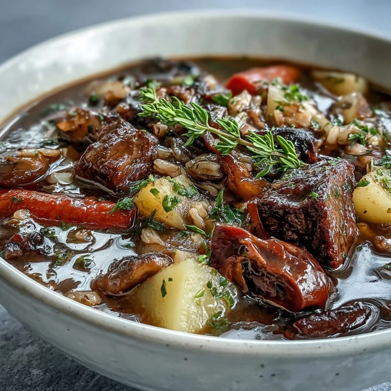 Save to Pinterest The scent of this Vegetable Beef, Barley, and Mushroom Soup always takes me back to the first snowfall last winter, when the flakes started falling unexpectedly early in November. I'd spent the morning gathering ingredients, not knowing the weather would turn, but somehow the universe knew exactly what comfort we'd need that evening. As the pot simmered on the stove, windows fogged with condensation, my kitchen became an island of warmth while white drifts piled up outside.